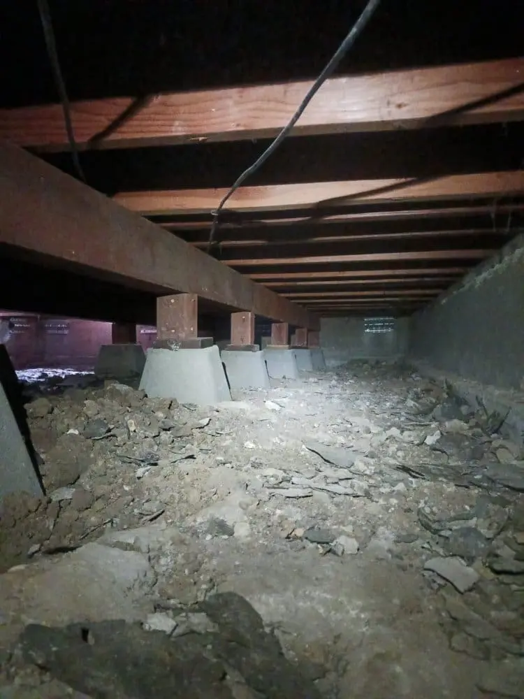 In this project, we installed earthquake retrofitting and two rows of support beams in the crawlspace. The earthquake retrofitting was completed with a city permit in accordance with the California standard plan for retrofitting. We also added support beams in the crawlspace to reinforce the floor that had sloped. The existing beams were short and did not extend from side to side (front footing to back footing). Some of the posts were replaced, but it was insufficient to bear the weight of the floor.
