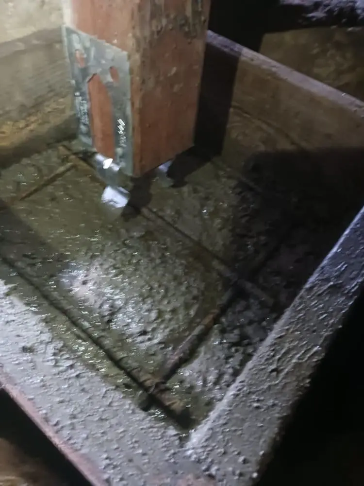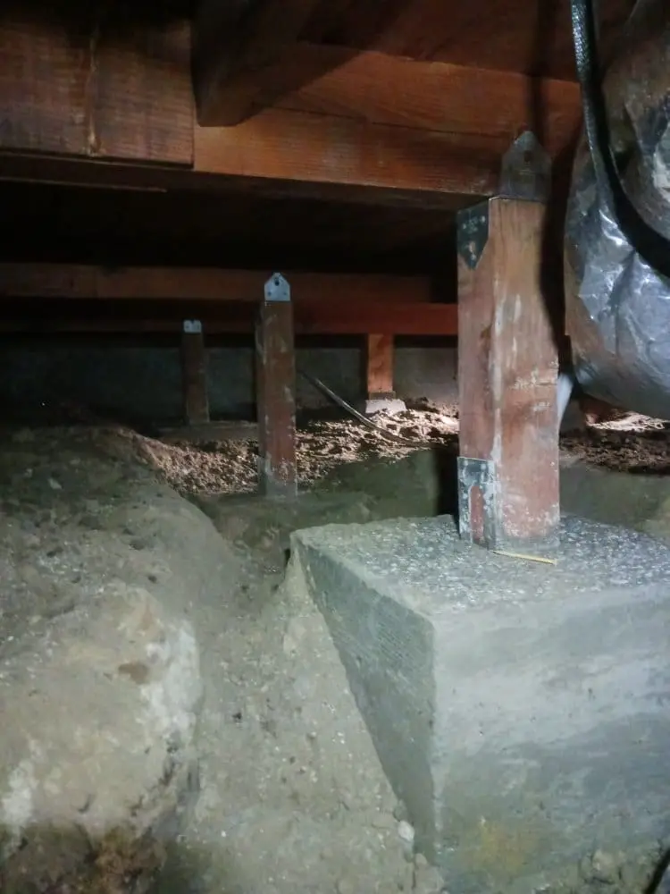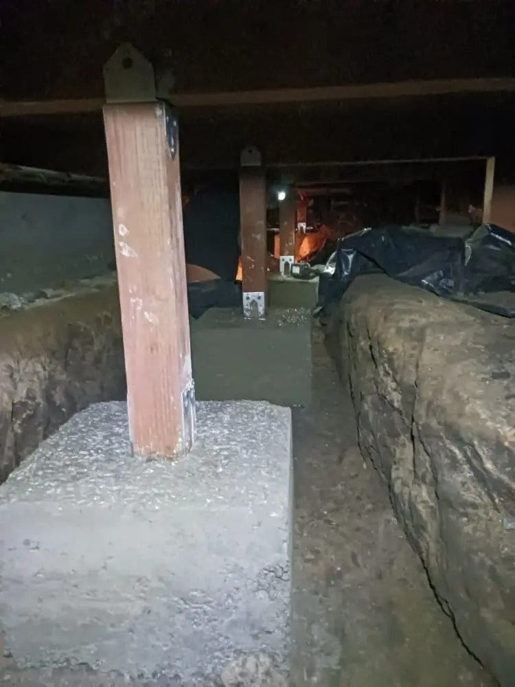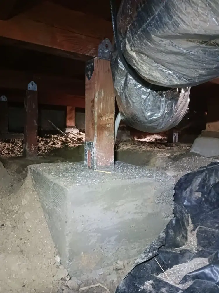 In this Walnut Creek project, the floor support lacked internal floor joists within the crawlspace, resulting in uneven flooring and drywall cracks throughout the house. To mitigate further leveling and settling concerns, we reinforced the existing girder beams with new 4×4 posts and substantial 18x18x12 deep concrete pads. The implementation of these robust pads will effectively distribute the load across the crawlspace, thereby stabilizing the floor system.
